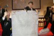 Stoere houthakkers die zich botvieren op een grote ijsklomp. Onder andere restaurateur Paul Fagel en beursmanager Joke van der Wijngaart deelden met een heuse hakbijl flinke klappen uit op een ijsblok. Het blok spatte voor de ogen van het publiek uiteen, waarna het logo in beeld kwam.