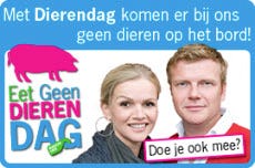 Op Dierendag worden in het hele land honden en poezen extra verwend. Maar op diezelfde dag gaan er ook weer ruim een miljoen dieren na een ellendig leven naar het slachthuis, aldus Wakker Dier. ‘Het is belangrijk dat mensen, juist op Dierendag, beseffen dat het anonieme stukje vlees op hun bord eigenlijk een dier is. Een dier dat net als een hond of een kat behoefte heeft aan buitenlucht en wat extra aandacht. Deze dieren kunnen we op twee manieren helpen: door te kiezen voor vlees met een welzijnskeurmerk, zoals biologisch of het Beter Leven keurmerk. Maar één dag per jaar, op Dierendag, moet het lukken om ook de grootste vleeseters een dagje vegetarisch te laten eten.’