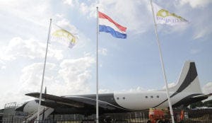De Ilyushin 18 staat naast het nieuw te bouwen luchthavengebouw van vliegveld Teuge. Gasten gaan via een met rood tapijt bekleedde vliegtuigtrap naar de cabine.
