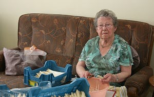 Oma Dien moet niets hebben van aspergeschilmachines. Daar gelooft ze niet in. Haar werkwijze is het witte goud schiller met de hand.
