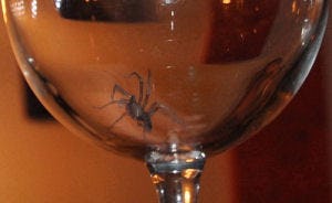 Hoe de spin in de wijn terecht is gekomen, is onduidelijk. ‘Hoe langer je er naar kijkt, hoe intrigerender het wordt. Ik denk dat ‘m maar op sterk water ga zetten. Dit is hoe dan ook een uniek expemplaar.’