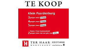 In de mailing staat met grote letters te lezen ‘Te Koop’. Daaronder staat Klein Paardenburg vermeld met daaronder drie-, vier- en vijfgangenmenu’s. De advertentie-ogende uiting wordt afgesloten met een logo van Ter Haar Makelaars.