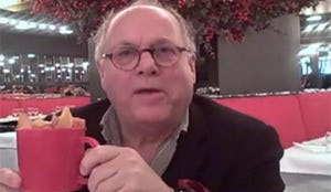 Directeur Dirk-Jan Doek overhandigde de cheque ter waarde van 5000 schoolmaaltijden aan Fill the Cup-ambassadeur Joop Braakhekke. Doek: ‘In de eerste vier maanden hebben we niet alleen gasten om 20 cent extra gevraagd, maar hebben we zelf ook van elke personeelsmaaltijd gedoneerd.’