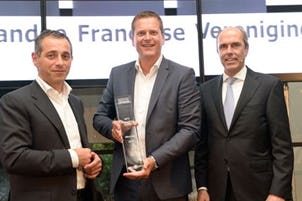 Philippe Vorst en Hans Miete, directieleden van New York Pizza: 'De trofee is een bekroning op het werk van onze franchisenemers en medewerkers in de afgelopen twintig jaar. Bovendien stimuleert het ons nog meer om de ingezette groei onverminderd voor te zetten.'