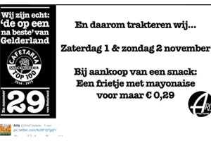 'Wij zijn echt: 'de op een na beste' van Gelderland', zo maakte Aris Frieterie in Laren via sociale media melding van plek 29 in de Cafetaria Top 100 2014/2015. 'En nummer 29 van Nederland. Daarom trakteren wij.'