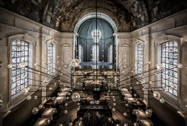 'Deze kapel van een oud militair ziekenhuis werd omgetoverd tot een aantrekkelijk restaurant van interieurontwerper Piet Boon', zo schrijft CNN. Blikvanger in het restaurant is een 800 kilo wegende kroonluchter met 150 lichtpunten. 'De gigantische design kroonluchters en nieuw glas in lood worden door CNN geprezen.