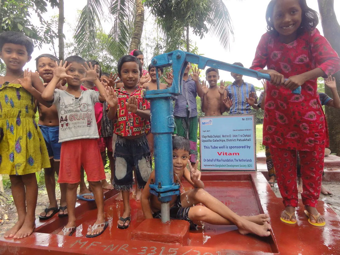 ‘Een mooi en duurzaam initiatief waarmee wij een bijdrage leveren aan een verhoogd welzijn van mensen die deze ondersteuning hard kunnen gebruiken’, aldus Vitam. De waterput is bij Char Kajal in Galachipa (Patuakhali, Bangladesh) gebouwd.