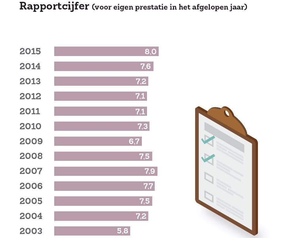 Nooit eerder waren ze met zijn allen zó positief. In recordjaar 2007 was dat een 7,9, dit jaar werd dat hoogste gemiddelde met 0,1 punt verbeterd tot een 8,0. Opvallend is daarbij dat er één keer een 10 werd gegeven, en geen enkele onvoldoende.