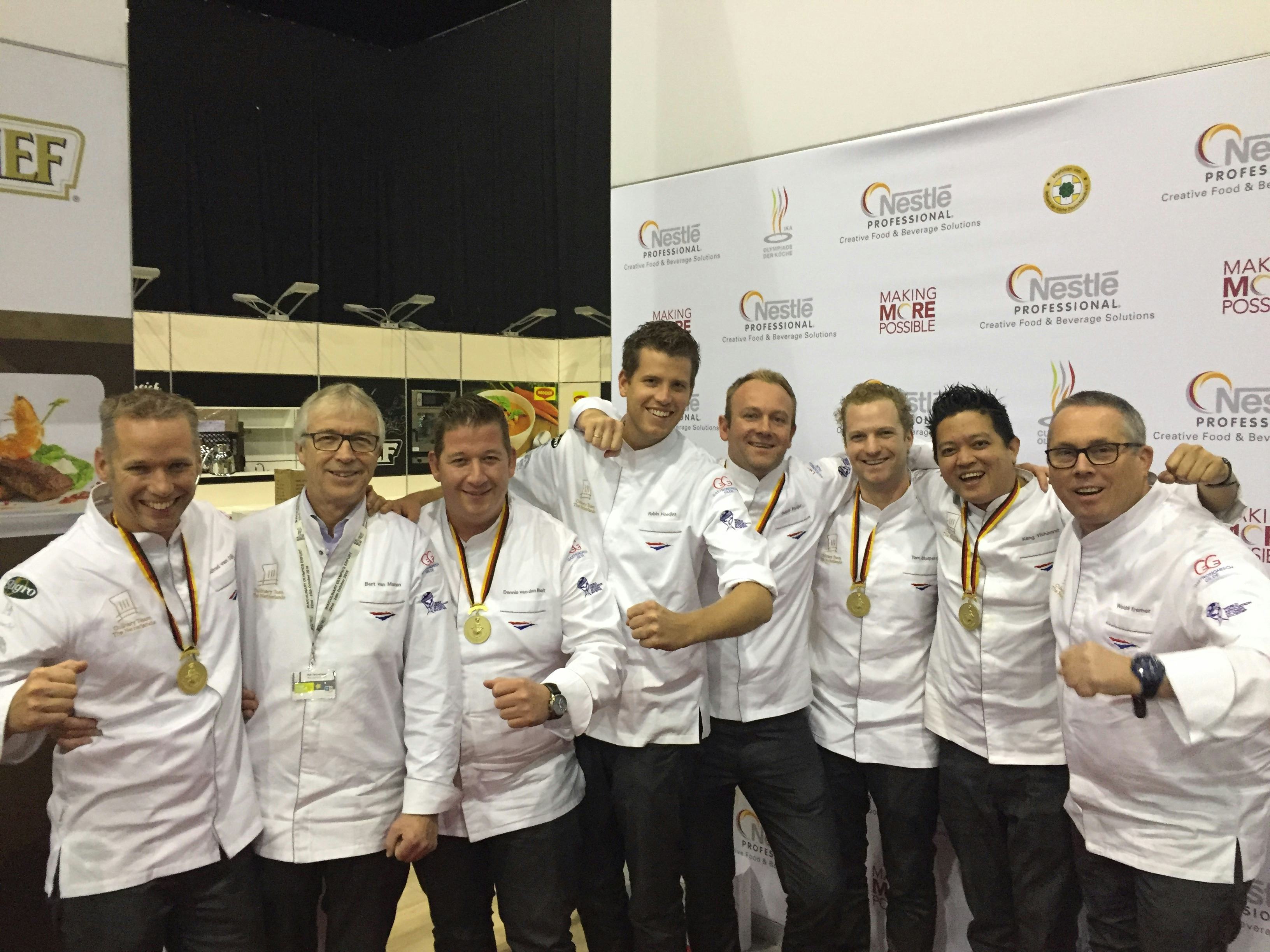 Na een spannende wedstrijd beoordeelde de jury het ‘koud buffet’ van het Nederlandse team met zilver. Alle tijd om feest te vieren had het team echter niet. De volgende dag moesten de voorbereidingen getroffen worden voor de wedstrijd ‘warme keuken’. Deze voorbereidingen werden op dinsdag 25 oktober beloond met een gouden medaille. Het Culinary Team The Netherlands bedankt de sponsoren die dit allemaal mogelijk hebben gemaakt.