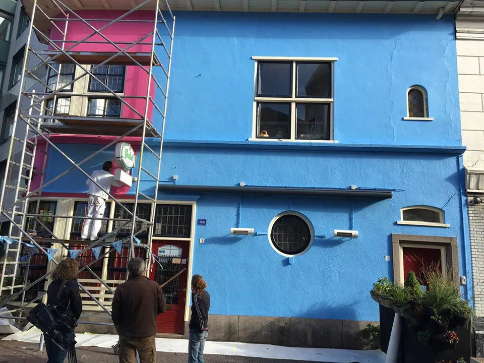 Dat is iets anders gelopen blijkt nu. Het café is blauw. 'We waren het roze wel een beetje zat', aldus 'een woordvoerder' tegen Omroep Gelderland. Het blauw is de kleur van de pegasus op de Airborne-vlag, de divisie die in de Tweede Wereld Oorlog streed bij De Slag om Arnhem, die jaarlijks herdacht wordt in de Gelderse Hoofdstad. Wethouder Gerrie Elferink, reageert in De Gelderlander minder enthousiast dan eerder op het roze café, dat hij 'schitterend' vond: 'Dat is niet handig van ze. Ik ga me er verder niet mee bemoeien. Het is nu aan hen om het uit te leggen aan Handhaving.'