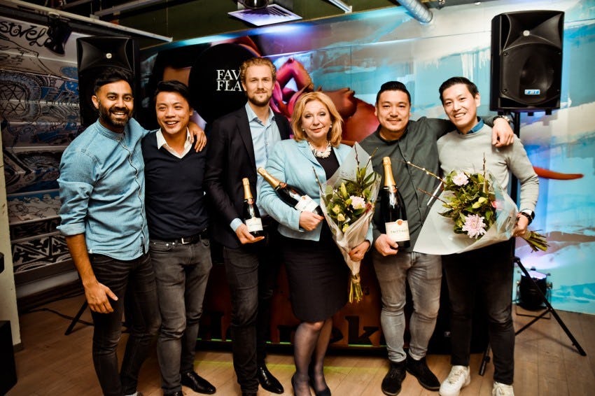 De jury: 'Vier jonge ondernemers hadden het lef om de eerste Foodhal, naar buitenlands voorbeeld, in Nederland neer te zetten. Twee jaar na opening hebben zij het bewezen: de Foodhallen ‘are there to stay’. Zij blijven vernieuwen door o.a. het aantrekken nieuwe chefs zoals Guillaume en Freek met hun Pita-concept.'