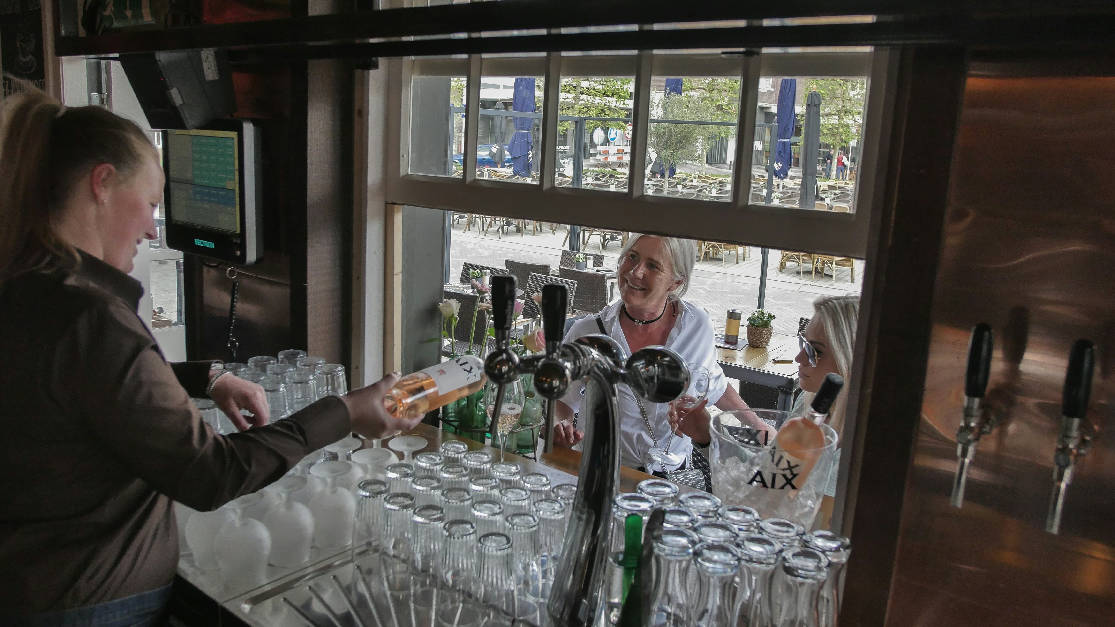 ‘De bierkraan zit tegen het kozijn aan, maar dus wel binnen zodat het voor de vergunning geen problemen oplevert. We zetten de ramen open, tappen onze biertjes en schuiven die over het barblad naar de gasten die buiten staan.’