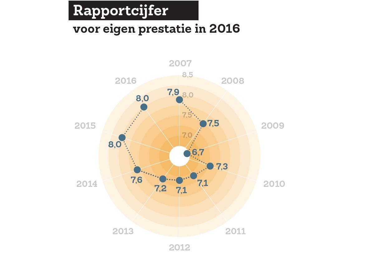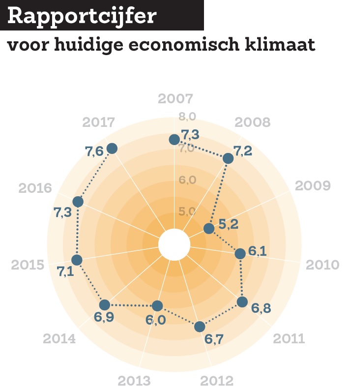 Ondernemers in de Top 100 geven elk jaar twee rapportcijfers: één voor de eigen prestatie in het voorgaande jaar en één voor het huidige economische klimaat. Het is maar een steekproef onder bijna 100 ondernemers, maar vormt een aardige graadmeter voor de stand van het land.
