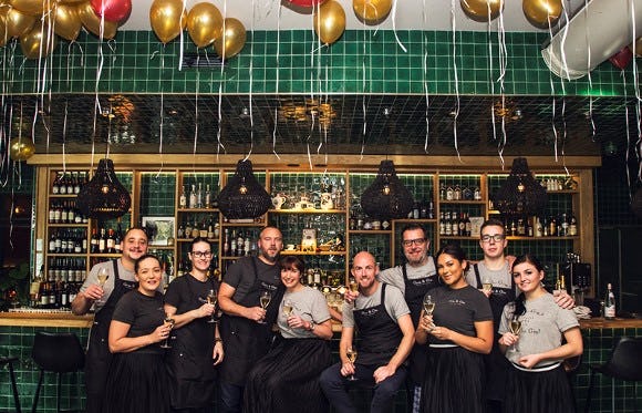 Driehonderd ballonnen in goud en rood sieren vandaag restaurant Gym & Gin. Frank Huson: 'Het is feest. We drinken al de hele dag champagne. We zijn heel erg opgelucht en dankbaar voor deze erkenning.'