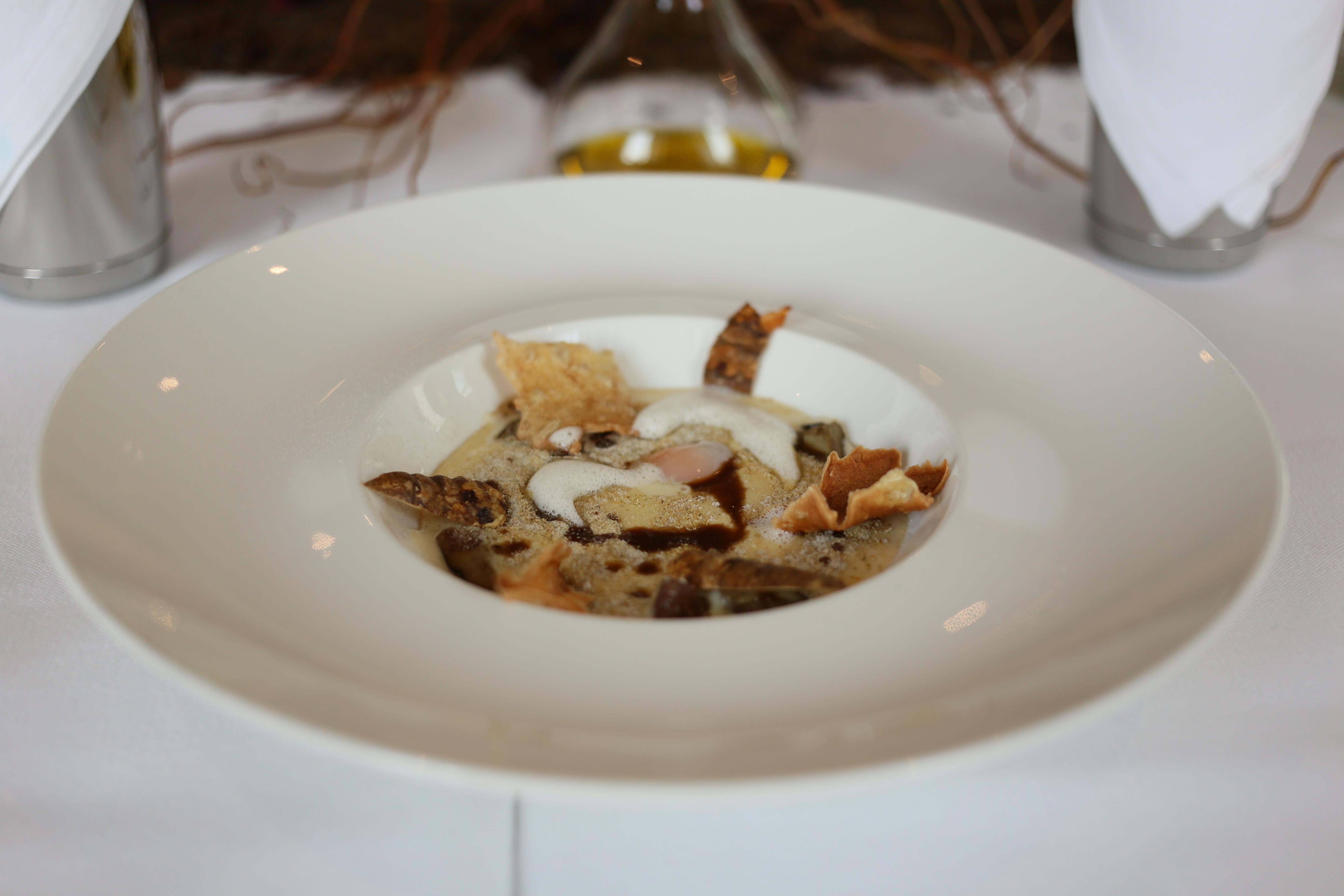 Crème van aardappel en prei, kwartelei, Fontina, hefstgroenten