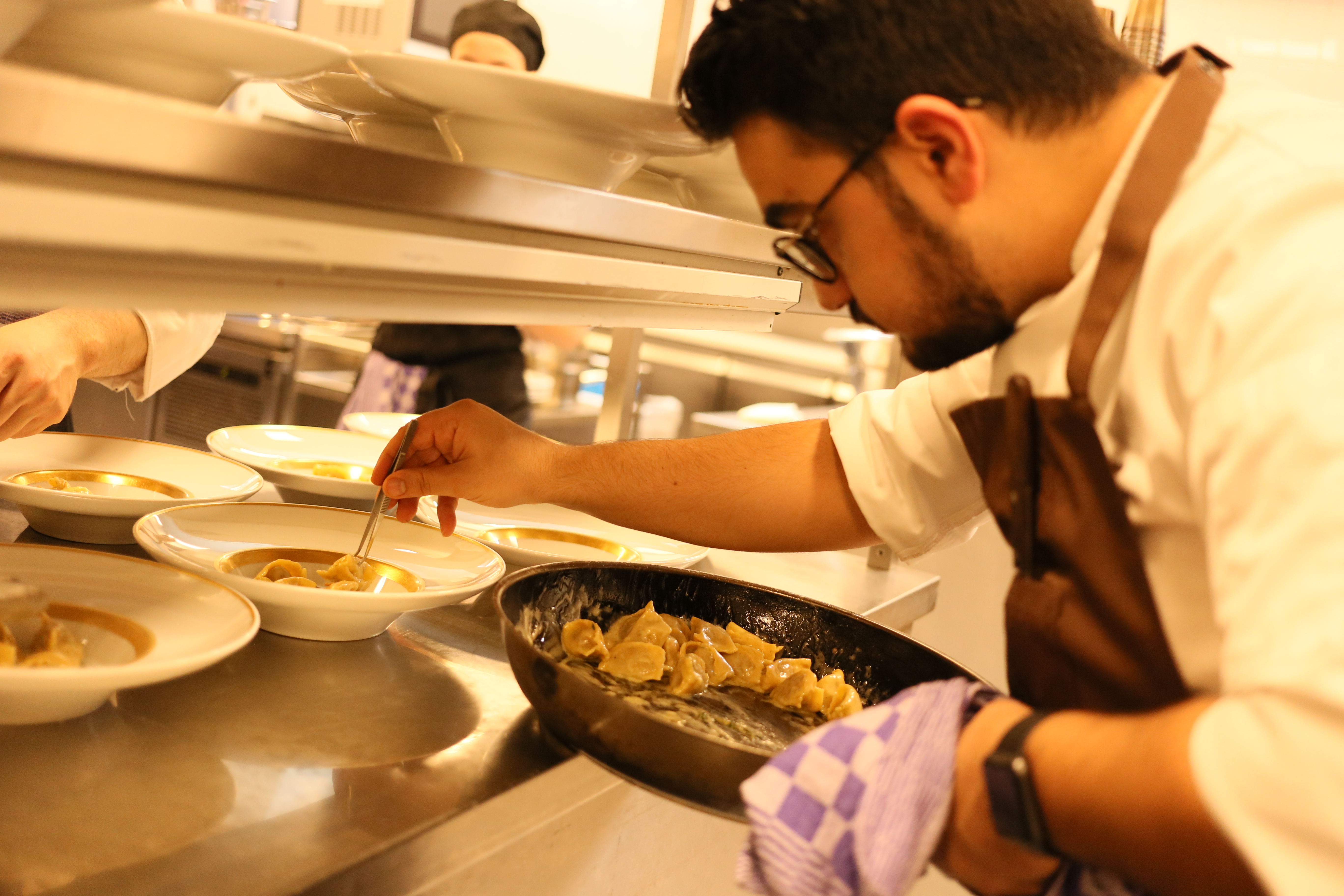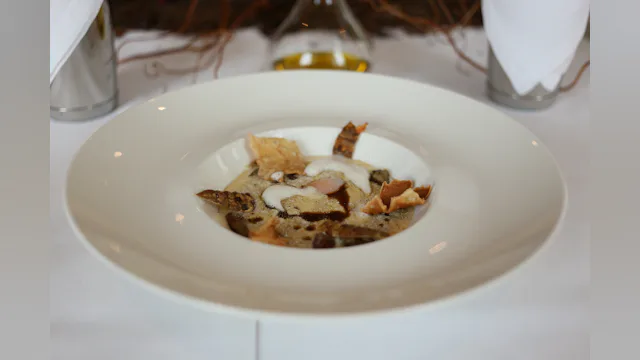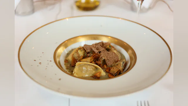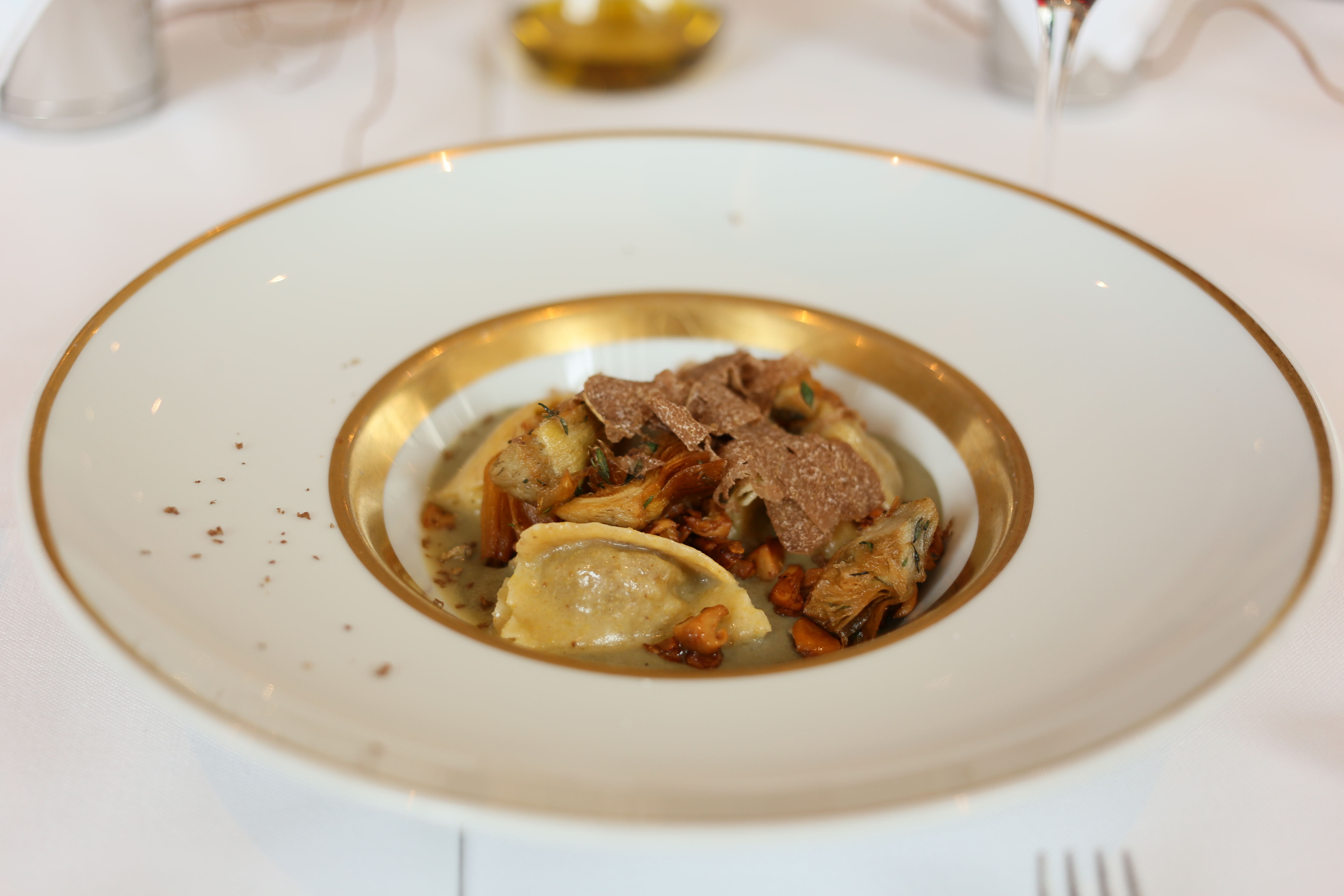 Ravioli van polenta gevuld met 'salsiccia' en cantharellen, artisjokcrème