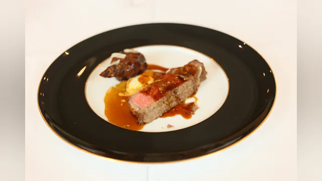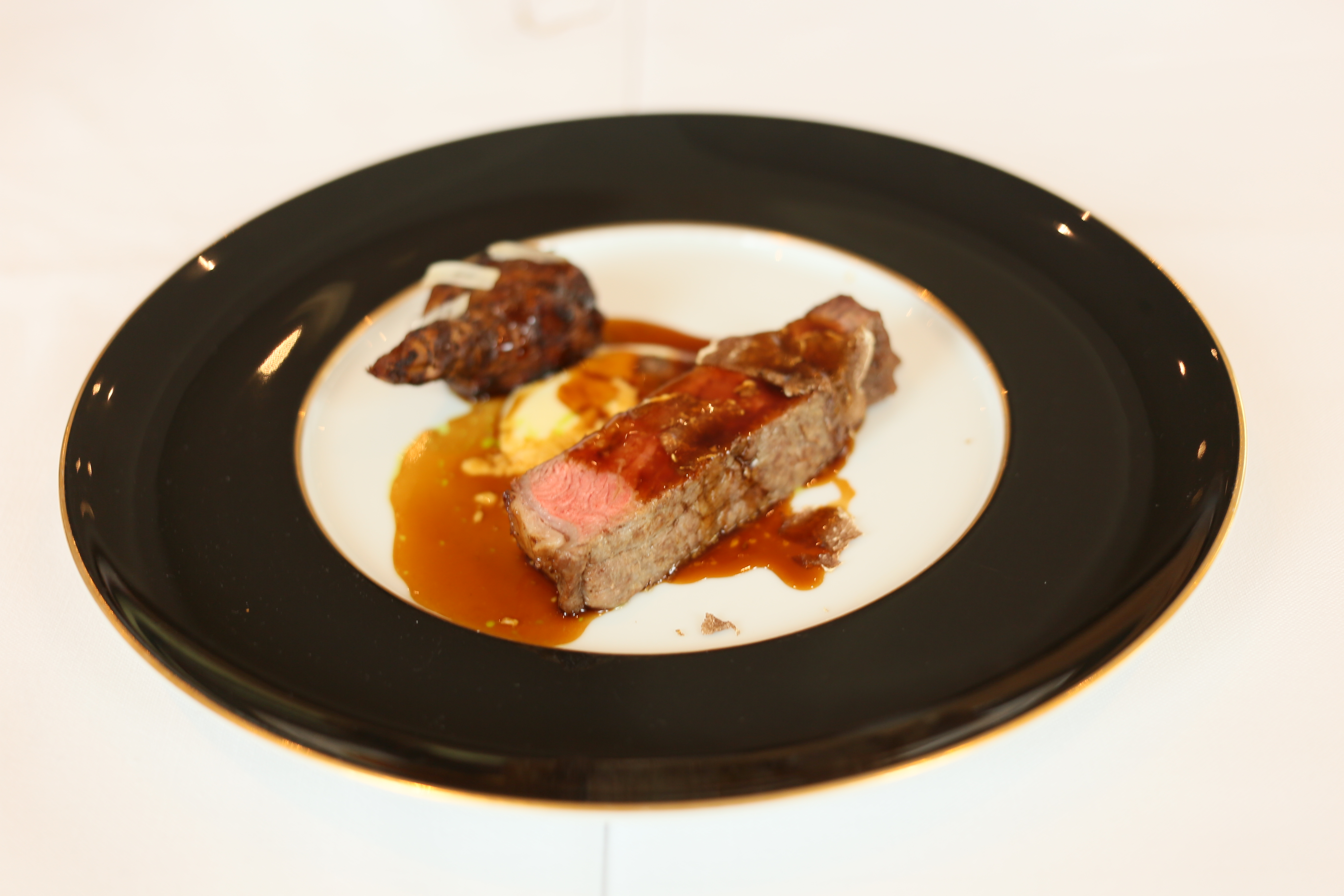 Rib-eye, melk gearomatiseerd met gekonfijte knoflook, demi-glace, in zout gepofte aardpeer