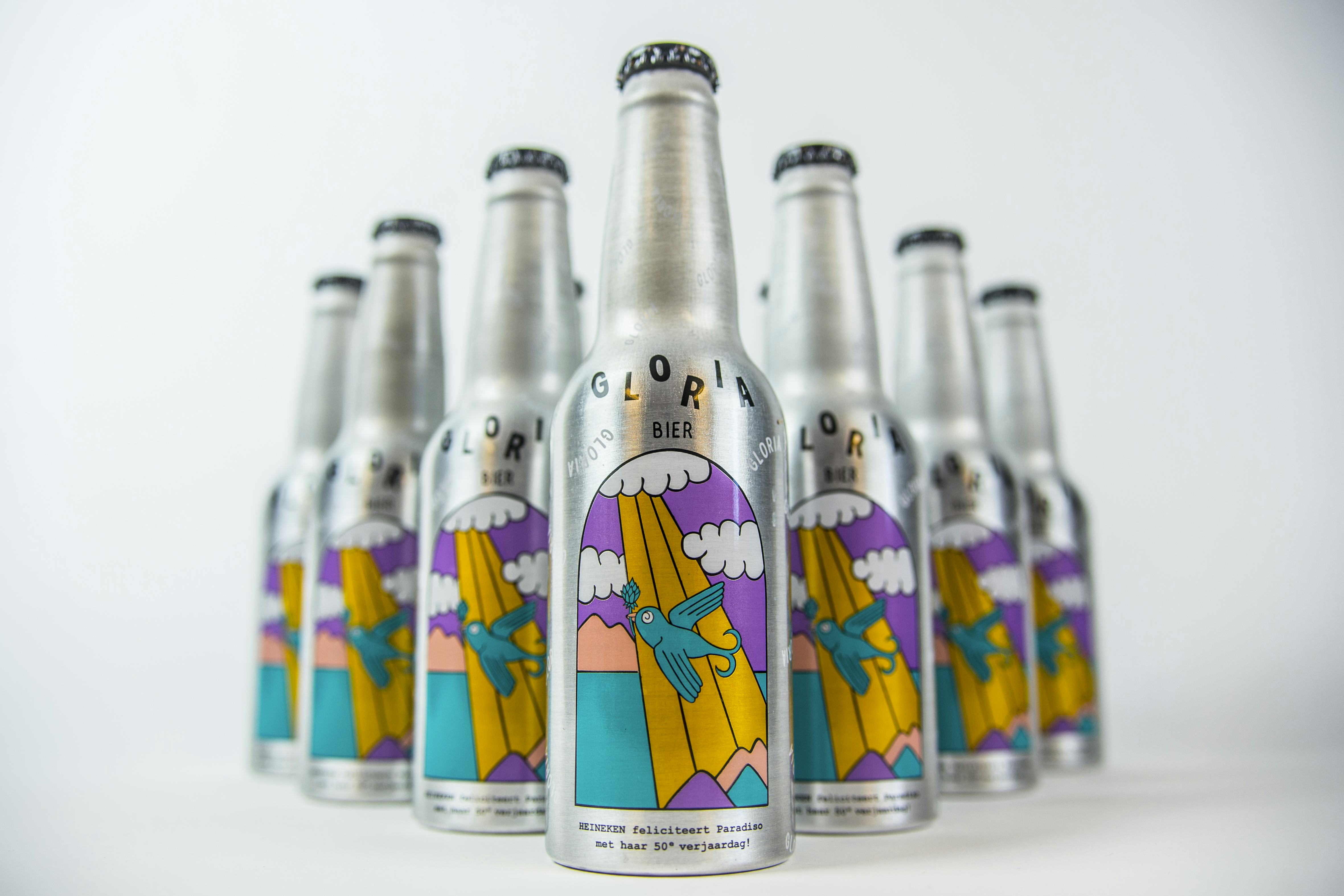 Ter ere van het 50-jarig bestaan van Paradiso wordt dit jaar het biertje ‘Gloria’ gebrouwen door de Amsterdamse brouwerij Poesiat & Kater. Gloria is een Golden Pale Ale (5,0% vol), gebotteld in een speciaal vormgegeven aluminium longneck met een moutig karakter en een fruitige afdronk.