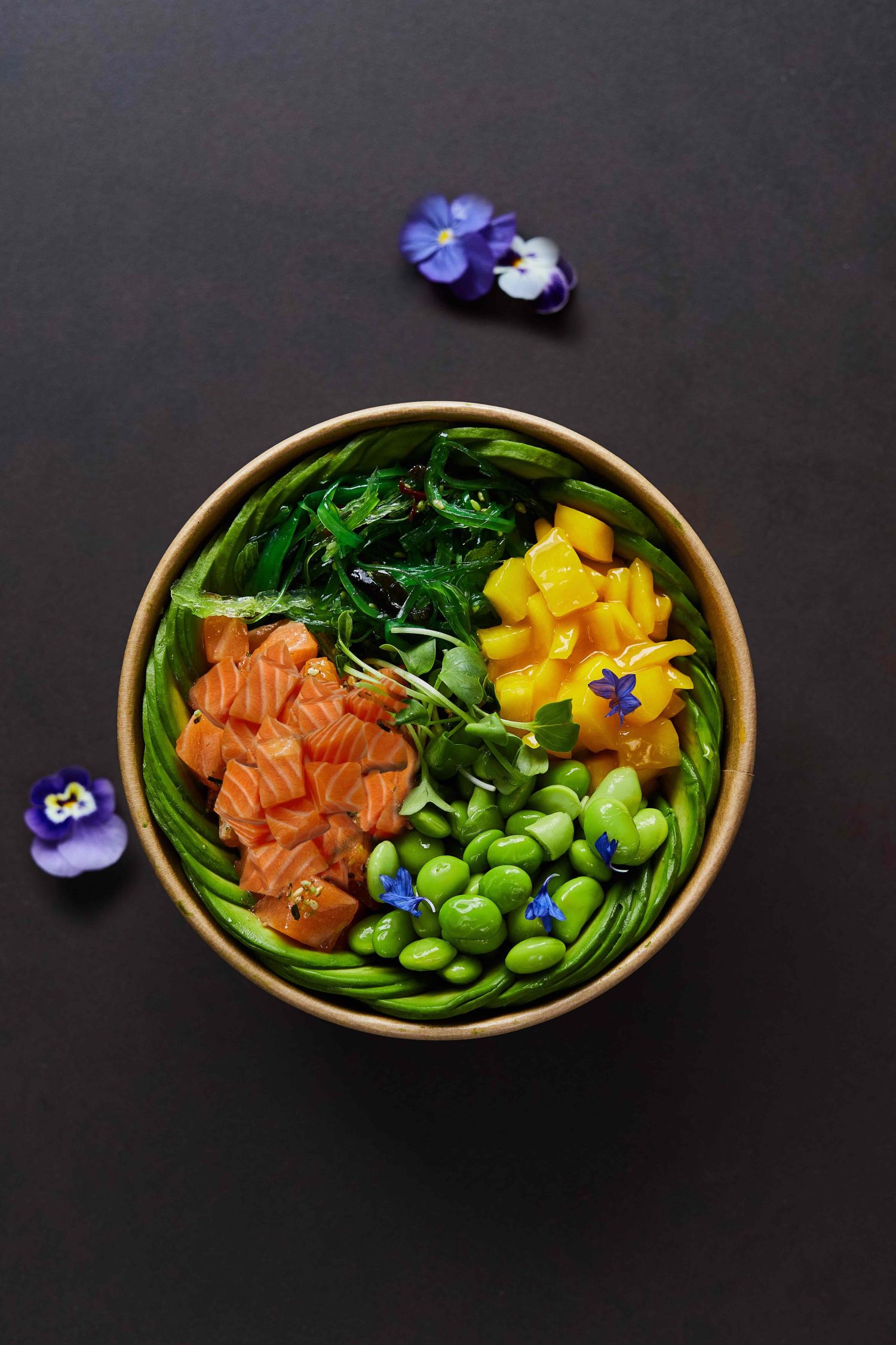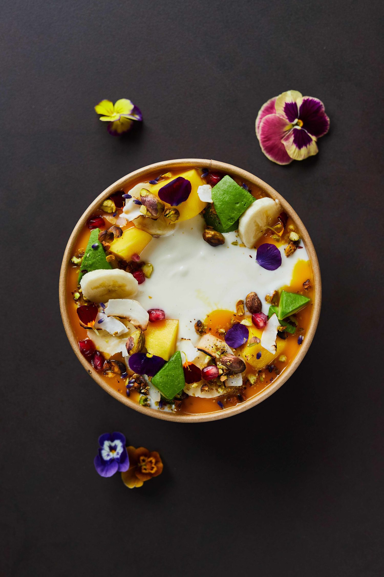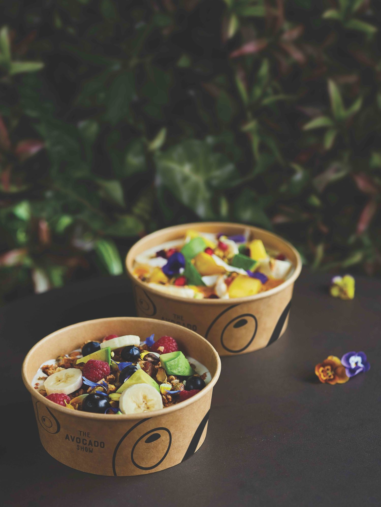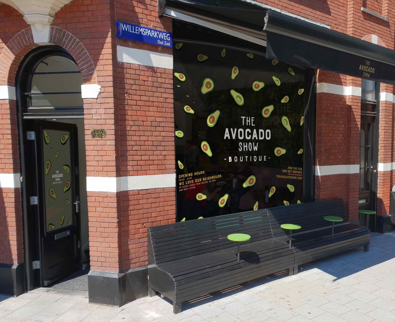 The Avocado Show Boutique heeft plek voor zo’n 15 gasten, het terras verdubbelt dat. Een – in eerste instantie – samenwerking met Foodora brengt The Avocado Show in een cirkel van 2.5 kilometer naar iedereen toe. ‘Zo kunnen veel meer gasten en locals in Amsterdam van The Avocado Show genieten. Om de kunstige avocadocreaties net zo mooi op de keukentafel te krijgen als in The Avocado Show was nog een flinke uitdaging. Op maat gemaakte packaging bleek de oplossing. Door de verpakking en de gerechten perfect op elkaar aan te sluiten, kunnen gerechten goed beschermd vervoerd worden. We zagen ook dat ons menu het beste tot zijn recht komt op een donkere ondergrond, dus kozen we voor donkere en duurzame packaging om onze stijl van foodfotografie en de merkfilosofie terug te laten komen in elke bestelling.’
