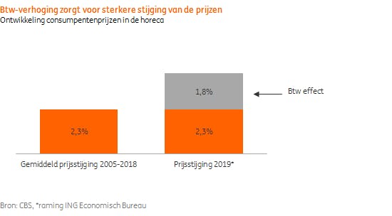 Horecaondernemers staan in 2019 voor de keuze om de verhoging van het lage btw tarief van 6% naar 9% door te rekenen of in te teren op de marge. In de meeste gevallen verwachten wij dat ze voor het eerste kiezen. Consumentenprijzen zullen daardoor met circa 4 procent stijgen, dat is sterker dan gebruikelijk. Van die prijsstijging is naar verwachting 1,8 procentpunt het gevolg van de btw-verhoging op onder andere logies, maaltijden en non-alcoholische drankjes. Doordat de btw omhoog gaat in een periode van hoogconjunctuur zullen consumenten hun gedrag niet massaal aanpassen. Het zal de groei van de volumes echter wel wat drukken.