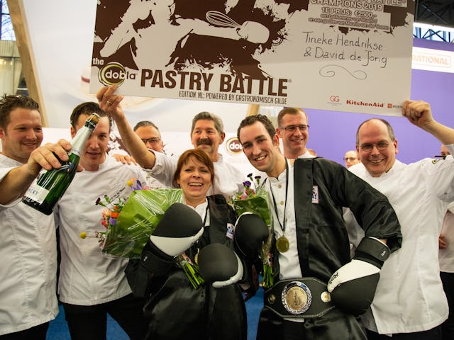 Het winnende patisserieduo van Culinair Centrum Beverwijk ging niet alleen naar huis met de titel, maar ook met de kampioensbelt en de hoofdprijs van €2500,- van Dobla. Daarnaast ontvingen ze een bakkersmes van Wüsthof en krijgen ze een gastles van toppatissier Maurits van der Vooren.