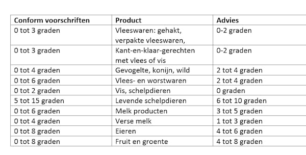 Het is natuurlijk belangrijk om vooraf te inventariseren wat je wilt bewaren in de koelkast. Verschillende producten hebben namelijk verschillende voorgeschreven bewaartemperaturen. In het volgende tabel geven we een overzicht: