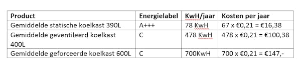 In dit voorbeeld zijn er model- en merkonafhankelijk diverse modellen met elkaar vergeleken. Uiteraard zijn er bijvoorbeeld ook geforceerde koelkasten die 500KwH verbruiken of juist modellen die 1500KwH verbruiken. Dit laatste zijn vaak zwaardere modellen die snel koelen, ook bij een omgevingstemperatuur van 43 graden, en daarmee geschikt voor zeer intensief gebruik.