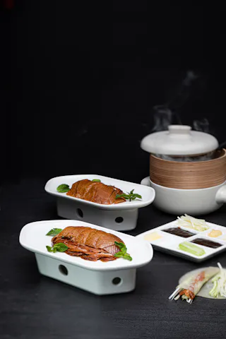 De 'Amber geroosterde Beijing-eend op traditionele wijze' is het absolute signatuurgerecht van Amber Garden. In huis wordt de 'fameuze eend' 36 uur lang gedroogd (dry aged) in speciale koelingen en daarna tot in perfectie gegrild. Een speciaal team is verantwoordelijk voor het volledige bereidingsproces van het meest beroemde gerecht van China.