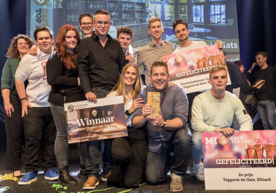 Frank en Sanne Braam staan met de prijzen onder hun arm te genieten kort na de bekendmaking. Ze zijn vijf jaar ondernemers van Tapperie de Gats in Sittard en staan in 2019 op nummer twee in de Café Top 100.