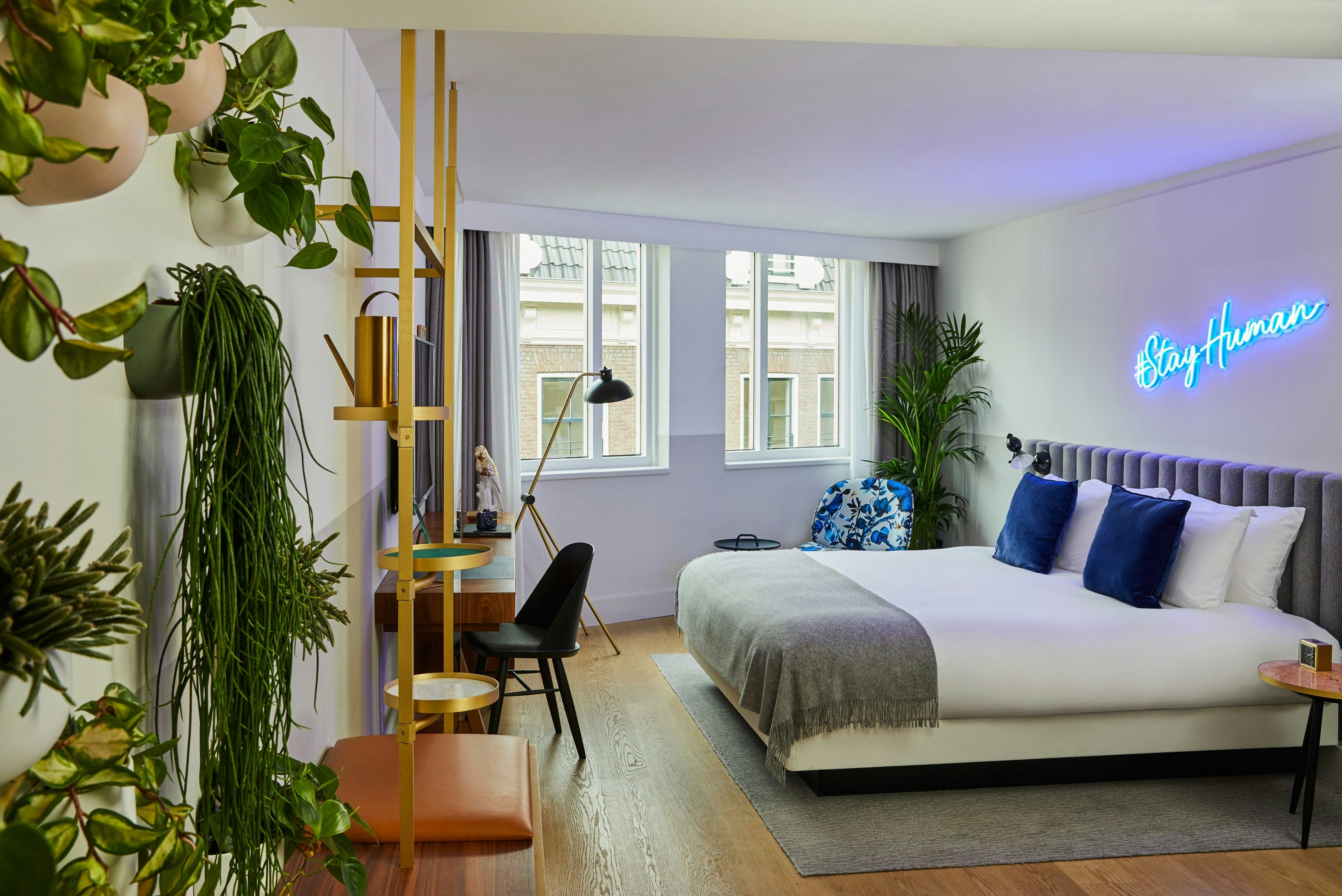In de Stay Human hotelkamer, met groot #StayHuman neon sign boven het bed, zijn verschillende items geplaatst die de connectie tussen gasten aanwakkert tijdens een verblijf. Zo zijn de gasten die in deze kamer verblijven collectief verantwoordelijk voor het welzijn en onderhoud van de grote plantenwand die in de kamer is geplaatst.