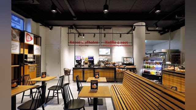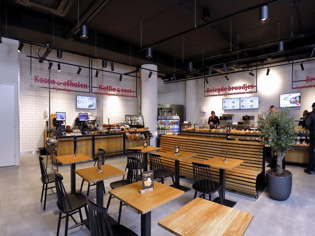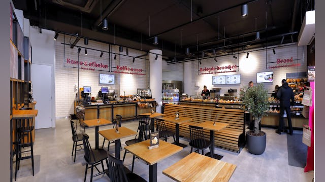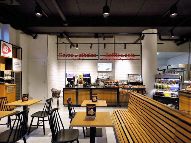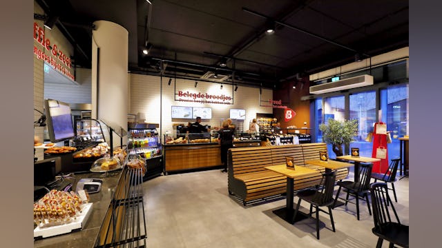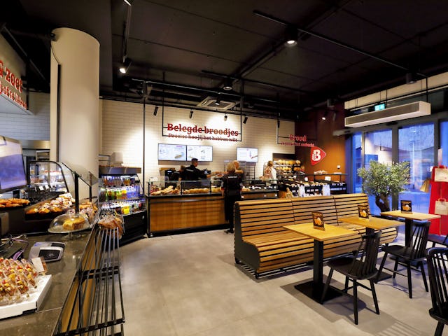 ‘We gaan niet aan tafel bedienen. Zo ver gaat Bakker Bart niet,’ laat woordvoerder Jan-Joris Heling desgevraagd weten. ‘Klanten lopen langs de counter, kiezen en pakken zelf hun producten.’ Hij voegt er wel aan toe dat koffie, snacks en belegde broodjes die ter plekke worden genuttigd een belangrijk deel van de omzet moeten vormen in Almelo.’ Welk deel van de omzet van Bakker Bart uit de consumptie ter plekke komt, kan Heling niet zeggen. ‘Dat is van veel factoren afhankelijk. Onder meer de grootte van de winkel, de locatie en het type winkel.’