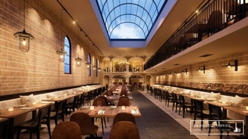 Het interieur eert de geschiedenis van het zeventiende-eeuwse gebouw, met een knipoog naar de nabijgelegen Sint-Janskerk. Het pand van zo’n negentig meter diep bestaat uit vier ruimtes, met plek voor tweehonderd gasten binnen en honderd buiten. Eye catcher is het glazen dak en zes grote glas in lood ramen, met afbeeldingen van kunstenares Heleen Verhoeven. De ramen zijn een verwijzing naar de glas in lood ramen van de Goudse Sint-Janskerk die op de Werelderfgoedlijst van Unesco staan. Ook de bogen van het zeventiende-eeuwse pand komen overal in het decor terug, gecombineerd met glas, staal en hout.
