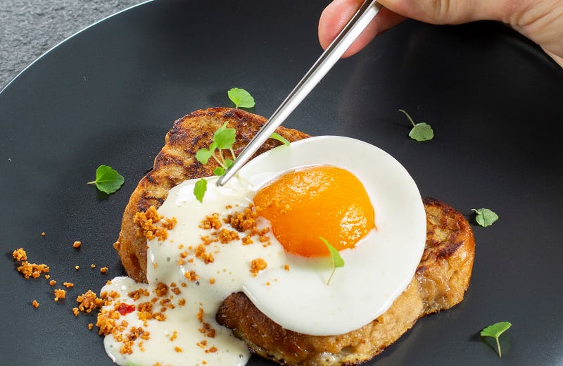 Meng de kokosmelk met de slagroom, citroengraspuree, suiker en agar agar. Breng dit aan de kook. Plaats een schaal in de vriezer zodat deze goed koud is voor gebruik. Leg plastic folie op de koude schaal en schep hier het kokosmengsel op, laat dit licht uitvloeien. Plaats de halve abrikoos in het midden van het kokosmengsel en laat het opstijven in de koeling. Meng de melk, ei, kaneel, vanillesuiker en dadeltapenade in een ruime schaal. Doop de plakken suikerbrood in het eimengsel en bak deze in een koekenpan mooi bruin. Plaats de plakken suikerbrood op een ovenrekje en leg hier de spiegeleitjes op. Verwarm het geheel gedurende 3 minuten op 160 °C.