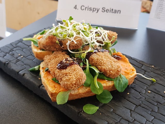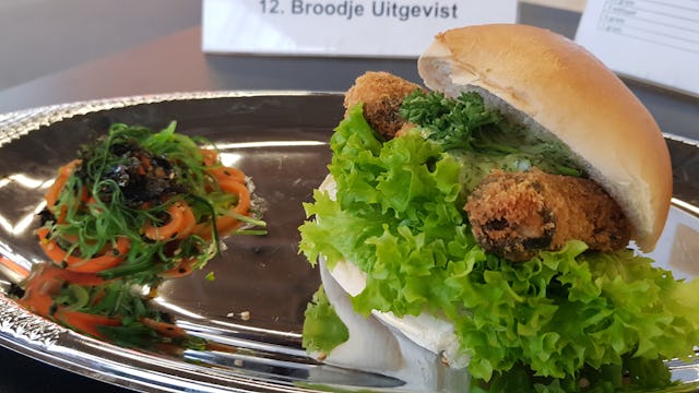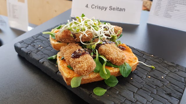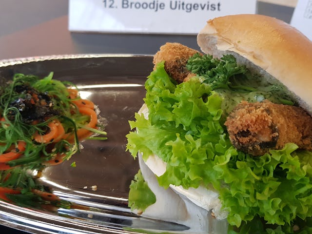 Sven Bergström van Koken & Smullen Catering in Amsterdam werd derde met Crispy Seitan, een maïsbroodje met onder meer zoete aardappel, Tahise rode curry pasta, gedroogde shiitake, veldsla en gefermenteerde zwarte bonen.