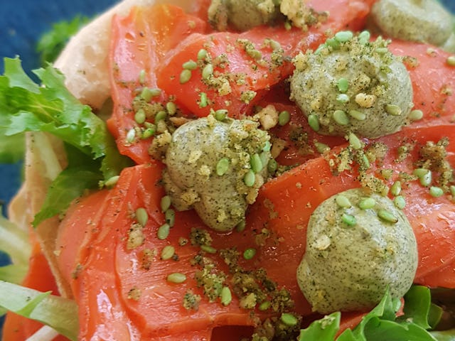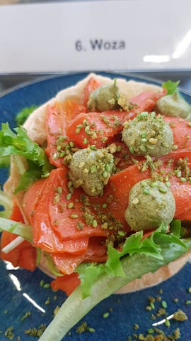 Van de Berg is daarnaast vooral visueel ingesteld. 'Ik kijk veel plaatjes, ik hou er niet van om echt recepten te volgen.' Zo werd ze geïnspireerd door een bloemstuk in de kerk, waarna ze van lente-ui bloemetjes heeft gemaakt voor op het broodje.