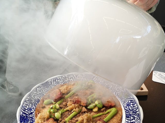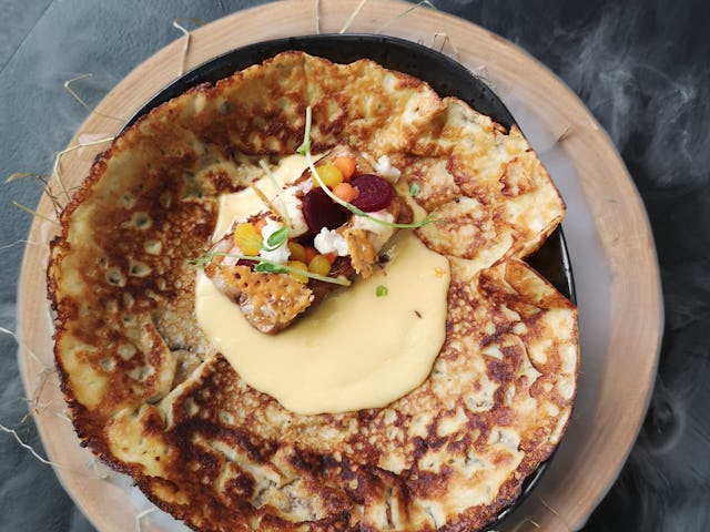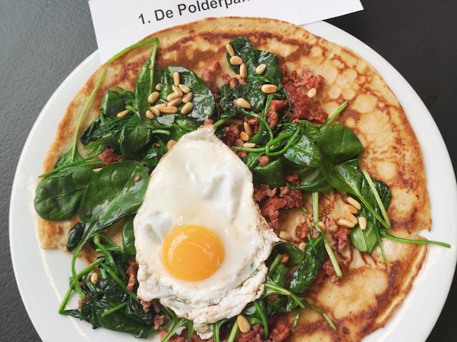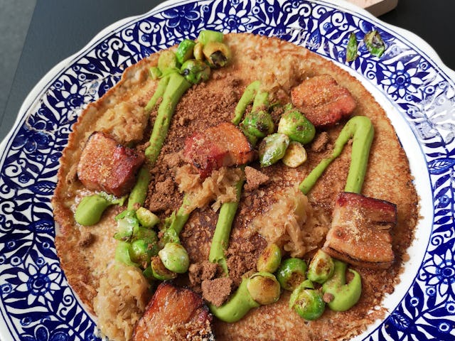 Voor zijn winnende creatie gebruikte Hollanders een naturel basispannenkoek, met daarop buikspek met speculaaskruiden en appelstroop, crème van spliterwten, gewokte spruiten en zuurkool. De pannenkoek staat nog niet op de menukaart van De Perdstal, maar dat gaat wel gebeuren, zegt Hollanders.