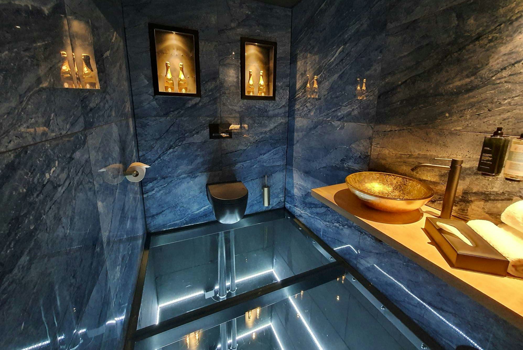 Dat toilet – dat met gouden champagneflessen, een gouden waskom, zwarte toiletpot en blauwmarmeren wandtegels al een luxe uitstraling heeft – bevindt zich bovenin een voormalige liftschacht. De vloer is van glas, waardoor gasten 18 meter naar beneden kijken. In die schacht zin verschillende lichteffecten aangebracht.