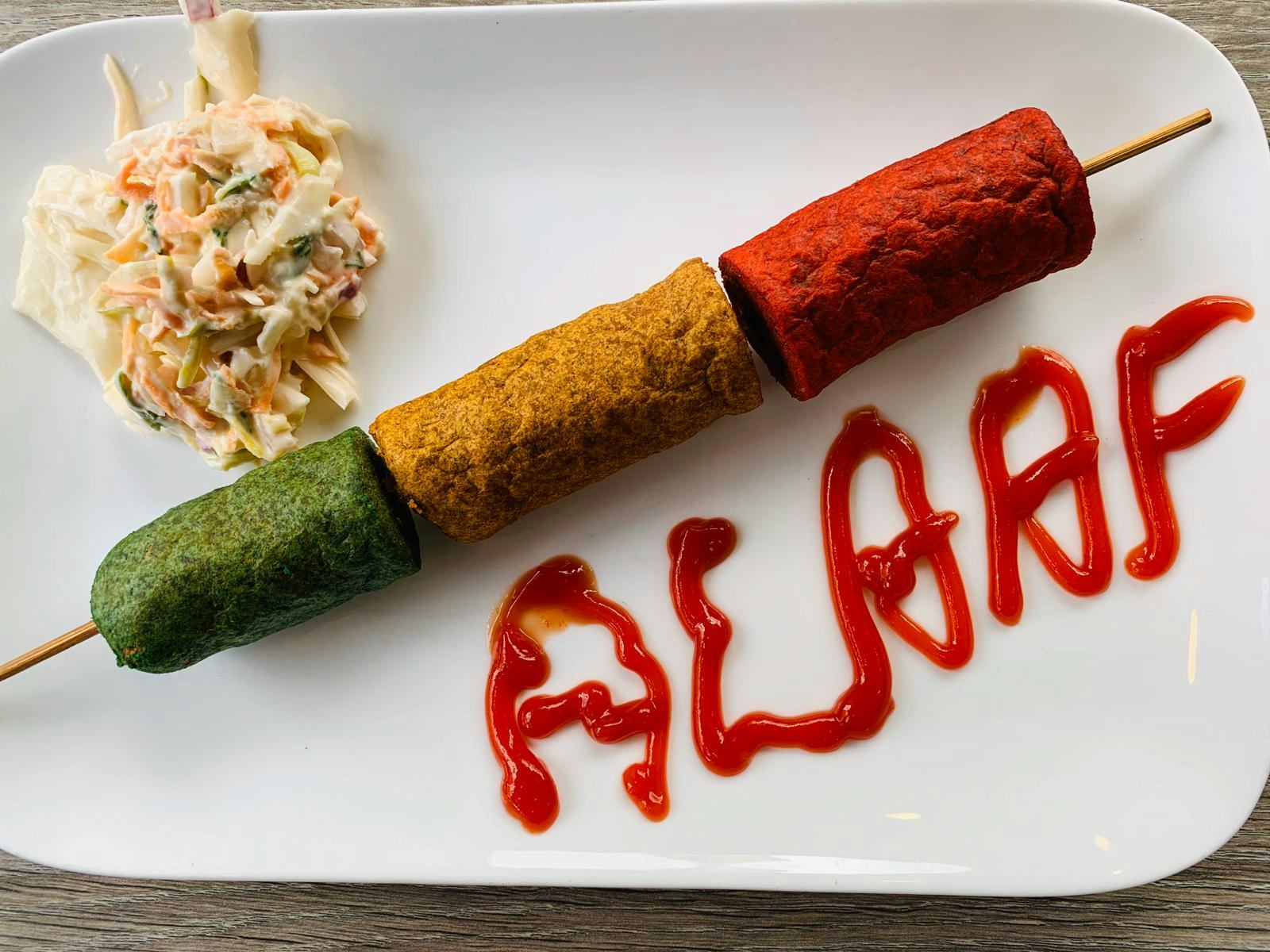 Net zoals de Vastelaovend friet van Eetwinkel Bebo heeft de Alaaf Staaf drie kleuren: rood, geen en groen, de kleuren van het Limburgse carnaval. Bedenker Nicole Oirbans snijdt de frikandel in drie stukjes en laat ze in aparte bakken met water en kleurstof weken. ‘Dat hoeft niet zo lang, ongeveer een kwartiertje. En alleen de kleurstof trekt erin, de frikandel wordt niet waterig. Net als bij de friet, die bakt gewoon lekker knapperig.’