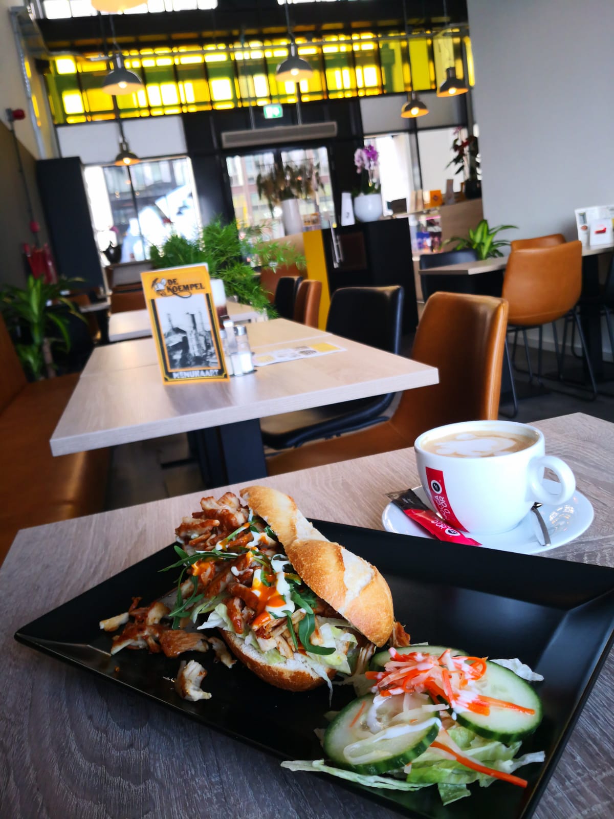 Cafetaria de Koempel heeft binnen 40 zitplekken met in de zomer een terras voor de deur. De ondernemers hebben zelf het meubilair uitgezocht en hebben voor de rest van het interieur samengewerkt met Daan de Haan Design in Venlo.
