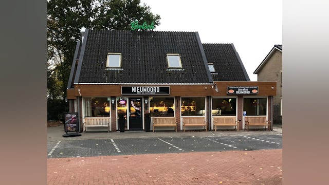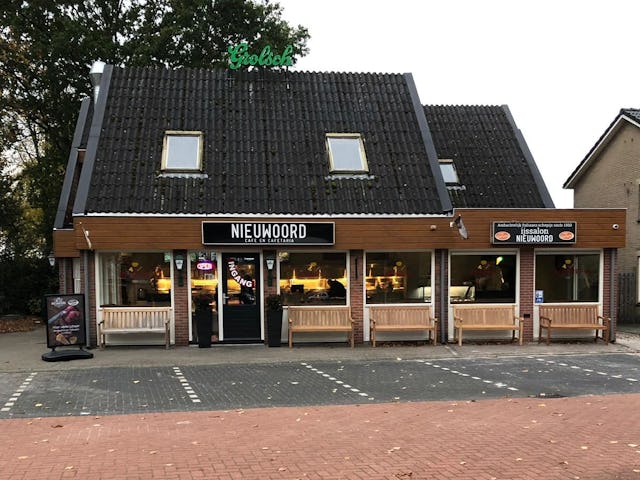 Café-cafetaria Nieuwoord in het Twentse Vroomshoop heeft een compleet nieuw interieur, met een nieuwe vloer, nieuwe wanden. De tafeltjes staan nu opgesteld aan een lange bank over de breedt van de zaak.’