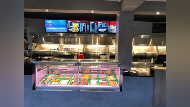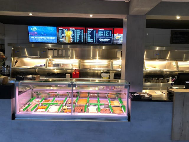 Ook qua bakcapaciteit is de cafetaria er flink op vooruit gegaan. De vorige bakwand was vijf meter lang, de nieuwe acht. ‘De bakwand was achttien jaar oud, die heeft zijn uren wel gedraaid. We hadden vijf ketels met elke twee mandjes. Nu hebben we er vier met elk drie en één ketel met twee mandjes. Acht mandjes voor friet, zes voor snacks. En een bakplaat van Adieu. De snackvitrine is ook nieuw.’