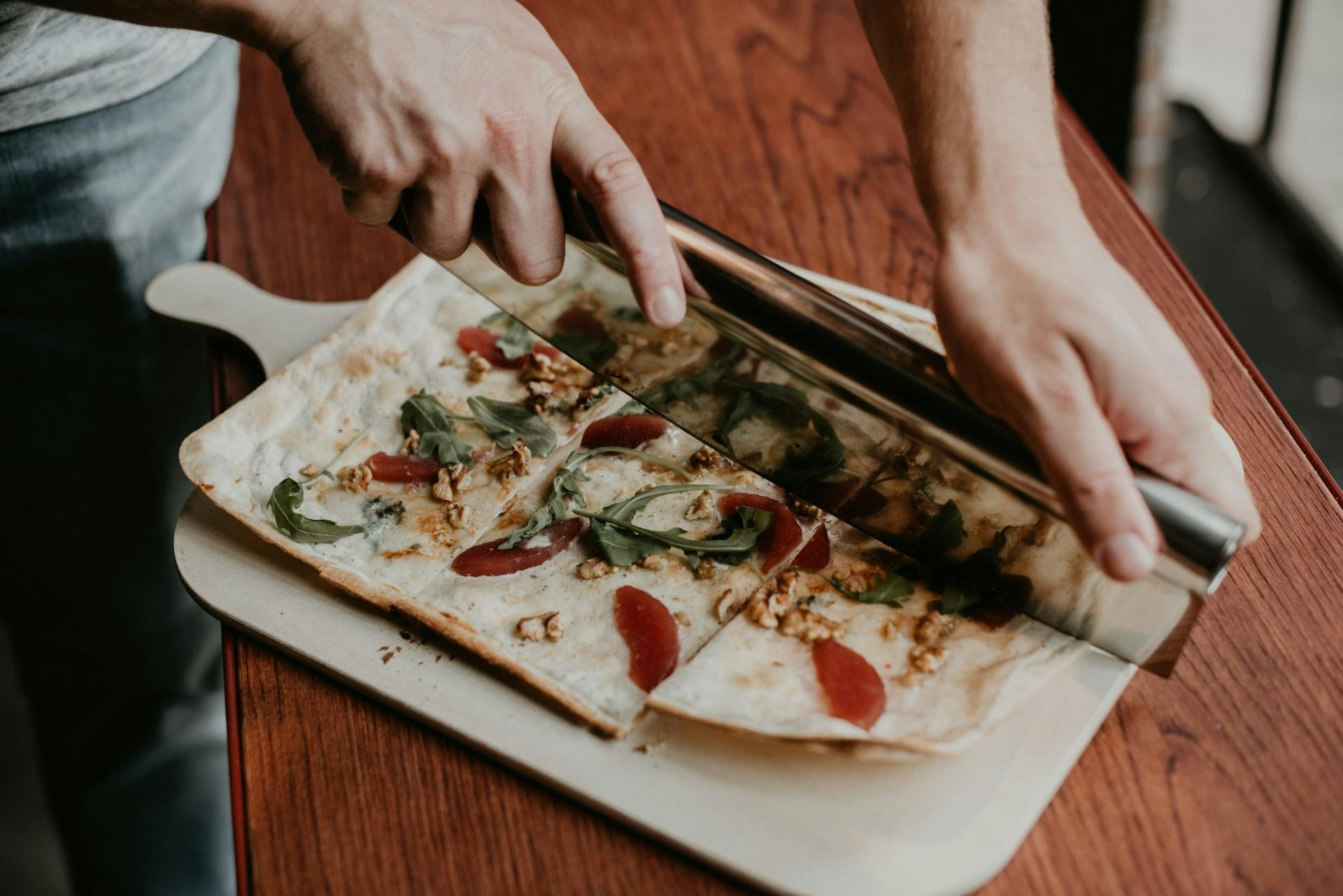 De flammkuchen worden gebakken in een houtoven en belegd met verschillende toppings. Het resultaat is een knapperige cracker die lijkt op pizza, maar anders smaakt.