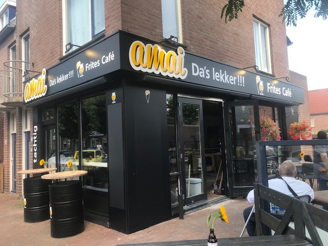 Voor het interieur van Amai Frites Café, een zaak van 35 vierkante meter, heeft Van Rutten gekozen voor een combinatie van hout en staal, met een goudkleurig plafond. Binnen staan twintig krukken, zowel aan de bar als langs de ramen. Op het terras is plaats voor 35 gasten. De naam Amai komt van over de grens, zegt Van Rutten. ‘Amai is Belgisch, en betekent zoiets als ‘allemachtig!”