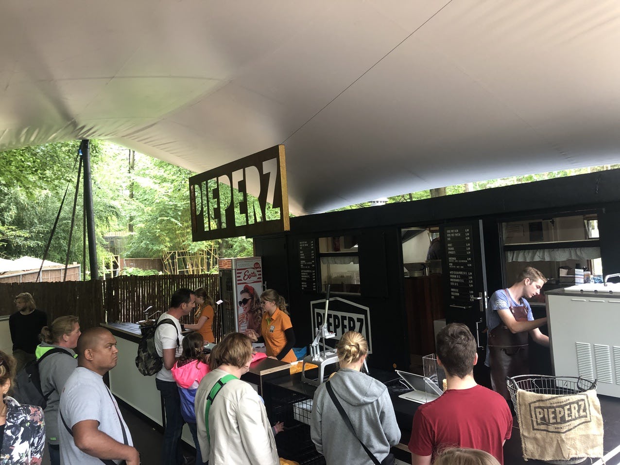 De pop-up van Pieperz in de Apenheul is een omgebouwde bouwkeet met een grote tent eroverheen en een buitenbalie. De vestiging bevindt zich aan het eind van het park. ‘We dachten dat we het vooral aan het einde van de dag druk zouden krijgen, maar de omzetverdeling over de hele dag is goed’, zegt Pieperz-eigenaar Ton Verhoeven.