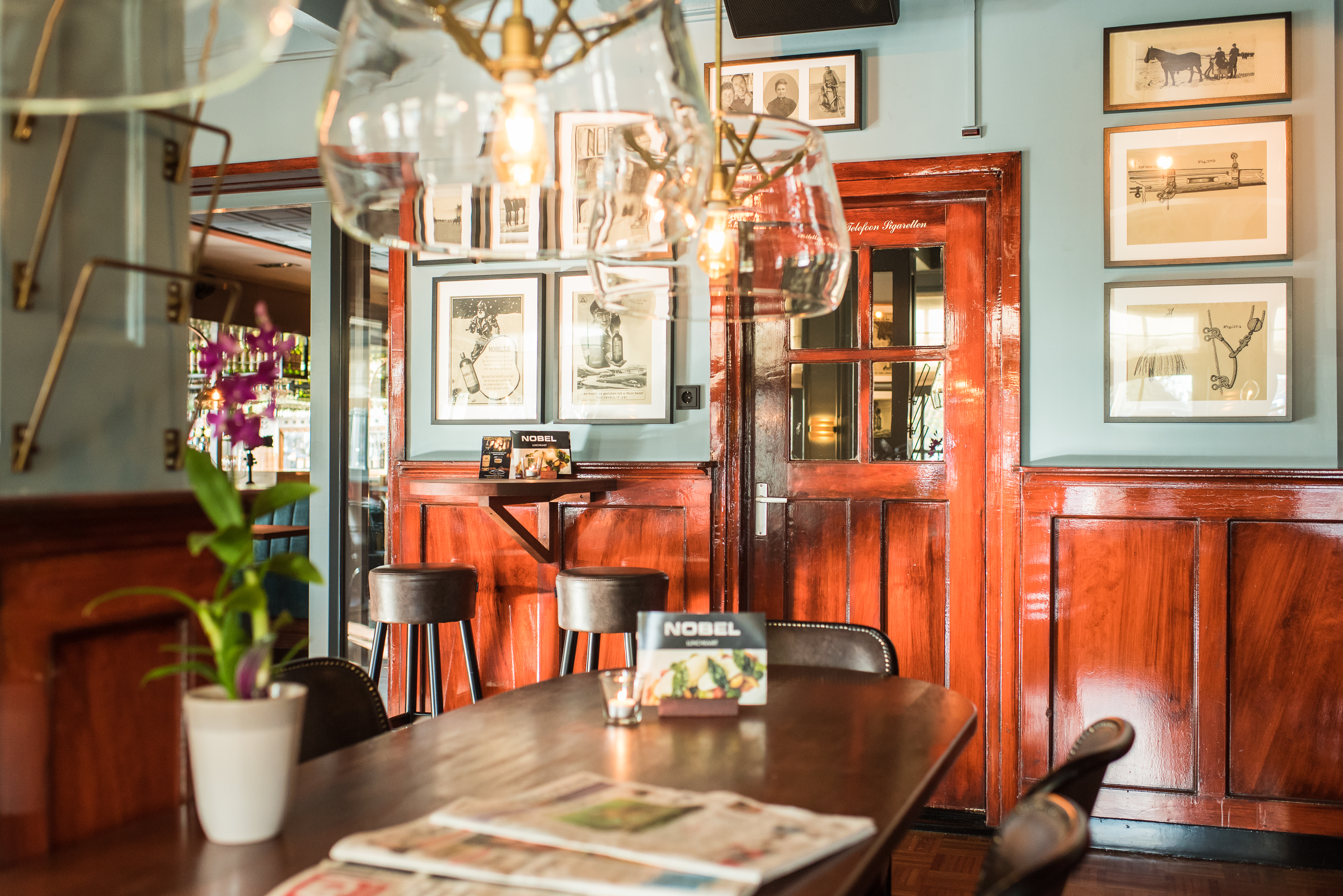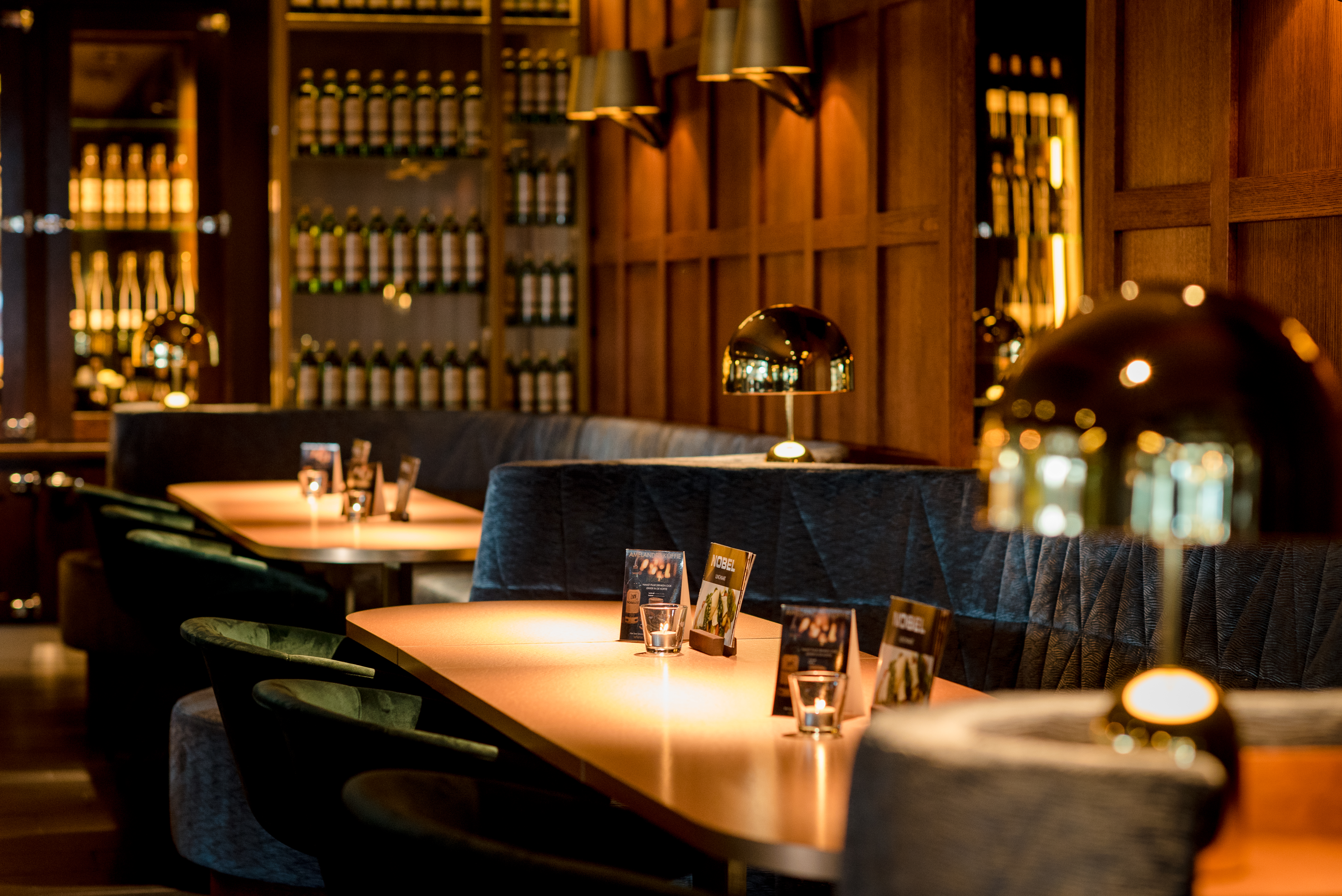 Het interieur van de nieuwe cafetaria Cowyn is industrieel en tijdloos met veel hout, staal en steen. ‘En op veel onderdelen is het best apart. Zo hebben we in het toilet een olievat als wastafel en hebben we magazijnstellingen gebruikt voor de tafels. Verder hangen er grote oude bunkerlampen. Dat soort dingen heeft ze opgescharreld bij antiekzaken. Maar het interieur straalt ook warmte uit, bijvoorbeeld door een pelletkachel met twee tafeltjes erbij.’