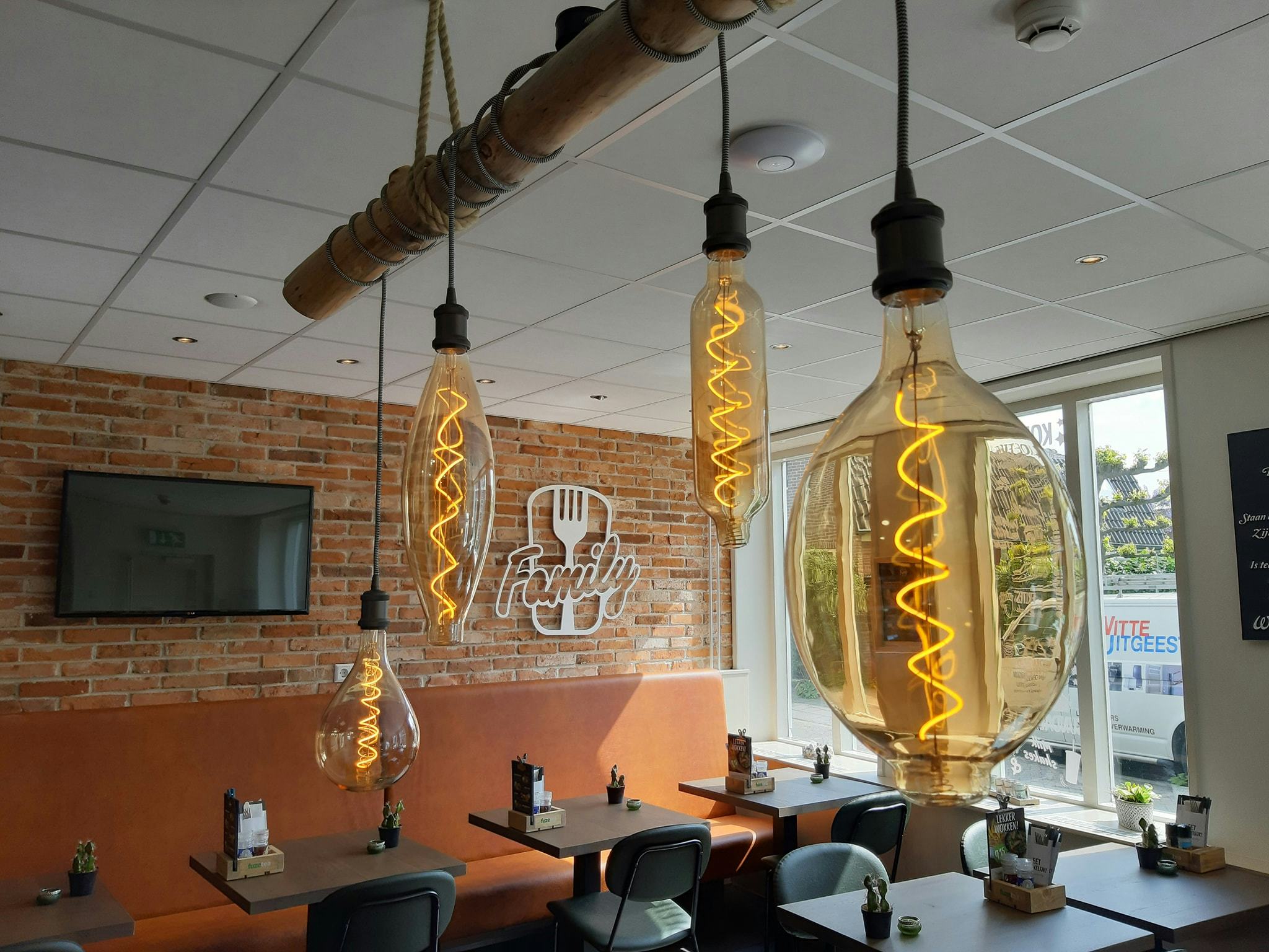 De echte blikvanger van de zaak is de boomstam die boven de stamtafel hangt. ‘Die hebben we zelf uit het bos gehaald, daar hangen nu de lampen aan.’ Van Hoolwerff is ook trots op de nieuwe bank. ‘Een leren bank van vier meter, in cognac kleur. Heel warm, vooral ’s avonds met de nieuwe verlichting erbij. Het is een hele verandering.’