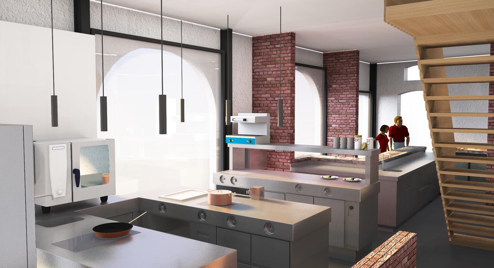 Van Heesbeen: ‘Bij Wouter van Laarhoven (Alma in Oisterwijk) vond ik de keuken heel gaaf. Onze keuken is ook open, met chefstable. Eigenlijk kun je vanaf elke tafel de keuken wel zien… Wij hebben gekozen voor dezelfde leverancier en krijgen ook het dekton. Materiaal dat er uit ziet als marmer, maar het is geprint en gebakken. Het is hitte en zuurbestendig. Wij kozen voor een donkere tint en combineren dat met hout. De afzuiging hangt aan draden in de nok van het pand.’