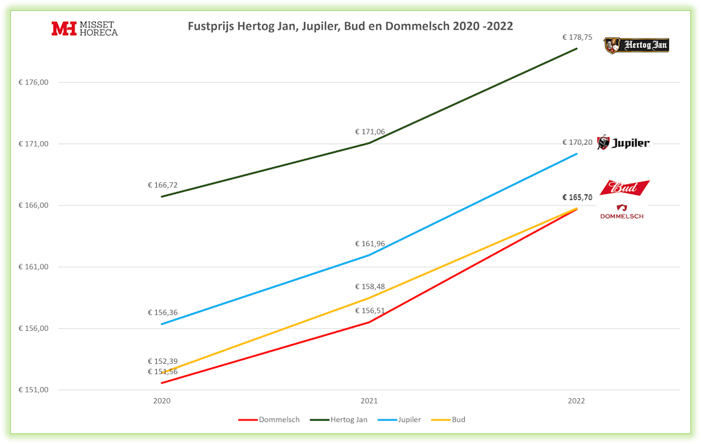 Ook de fustprijs stijgt traditioneel mee met de jaren. Dommelsch is ook hier de hardste stijger. Van €151,56 voor een 50-literfust in 2020, ging de prijs van €156,51 in 2021 naar €165,70 in 2022. Dat betekent een verhoging van 9 procent sinds de coronacrisis voor horecaondernemers.