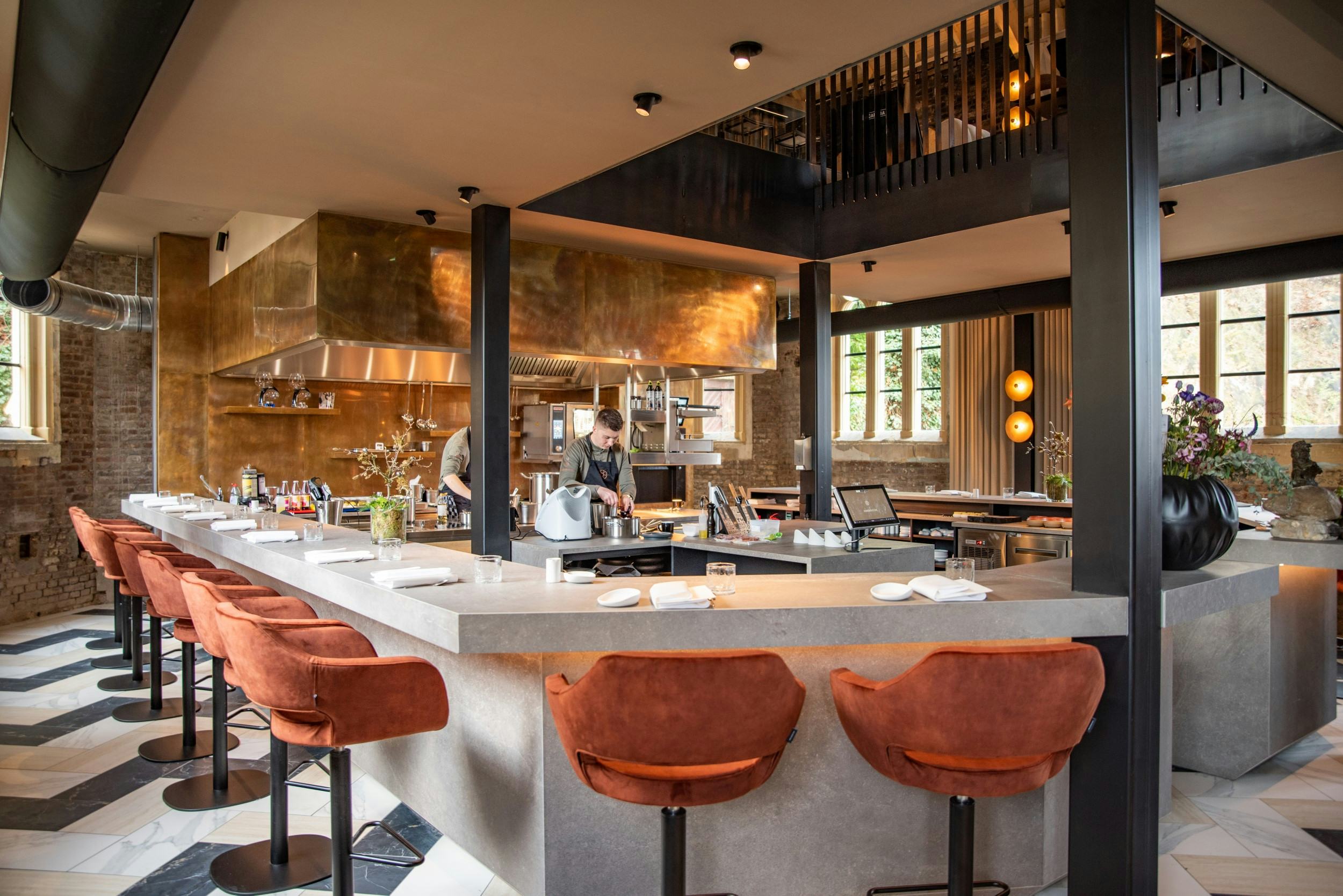 DesignerTim Reiters van Ontwerpbureau Reiters in Maastricht tekende voor het interieurontwerp. De chef’s table is gemaakt van keramiek dat er uitziet als beton. Eyecatcher op de vide is het ‘drankorgel’, de bar met orgelpijpen van blauwstaal. De muren zijn ruw en onafgewerkt gelaten, waarbij door de brand zwartgeblakerde delen te zien zijn. Als contrast zijn er zachte materialen als stof en leer gebruikt voor de bekleding van de banken en stoelen en hangen er stoffen gordijnen.