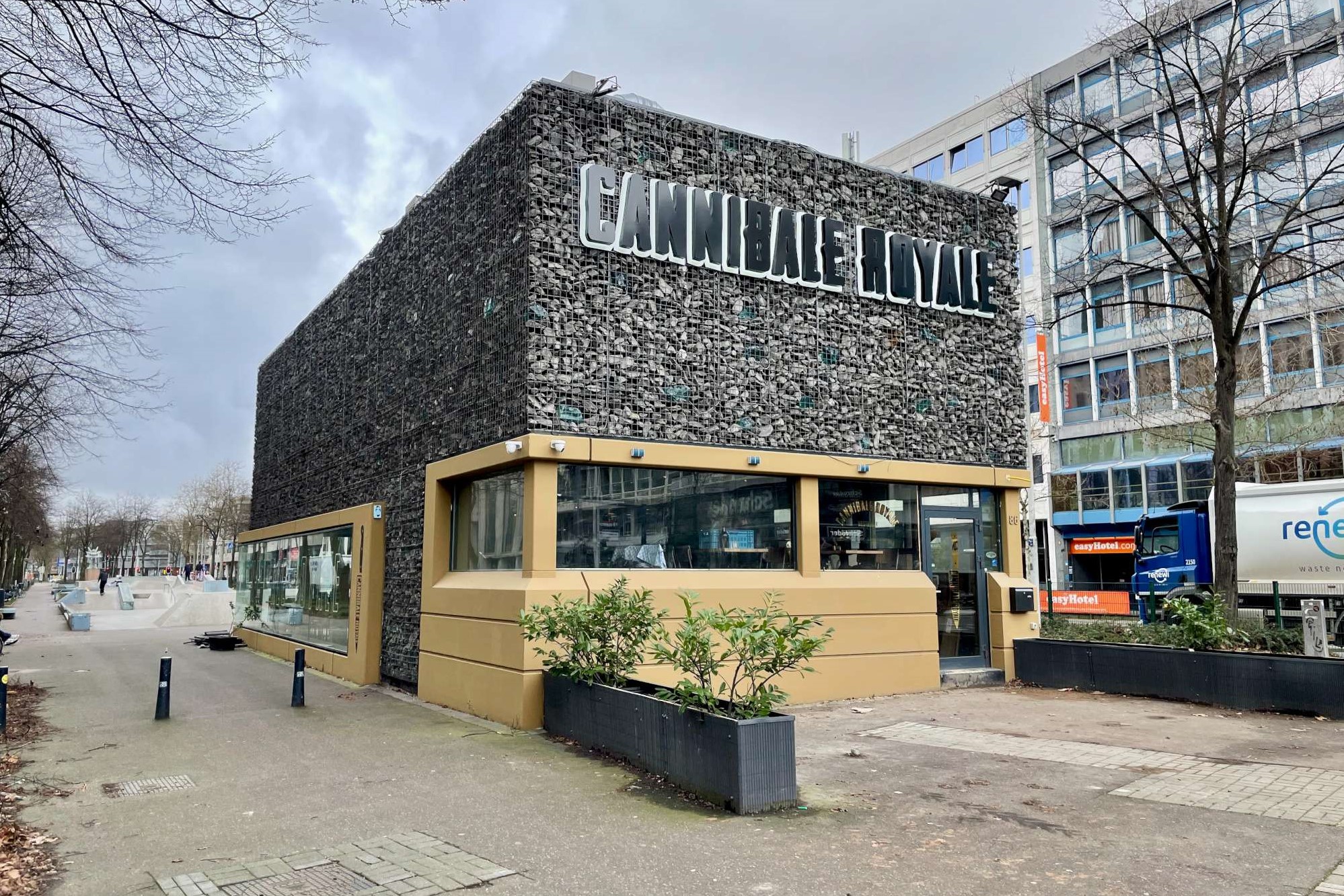 De Rotterdamse vestiging van Cannibale Royale zit aan de Westblaak in het centrum van de stad. Een plek die alle Rotterdammers kennen, in de brede middenberm van deze straat bevindt zich namelijk het grootste skatepark van Europa.